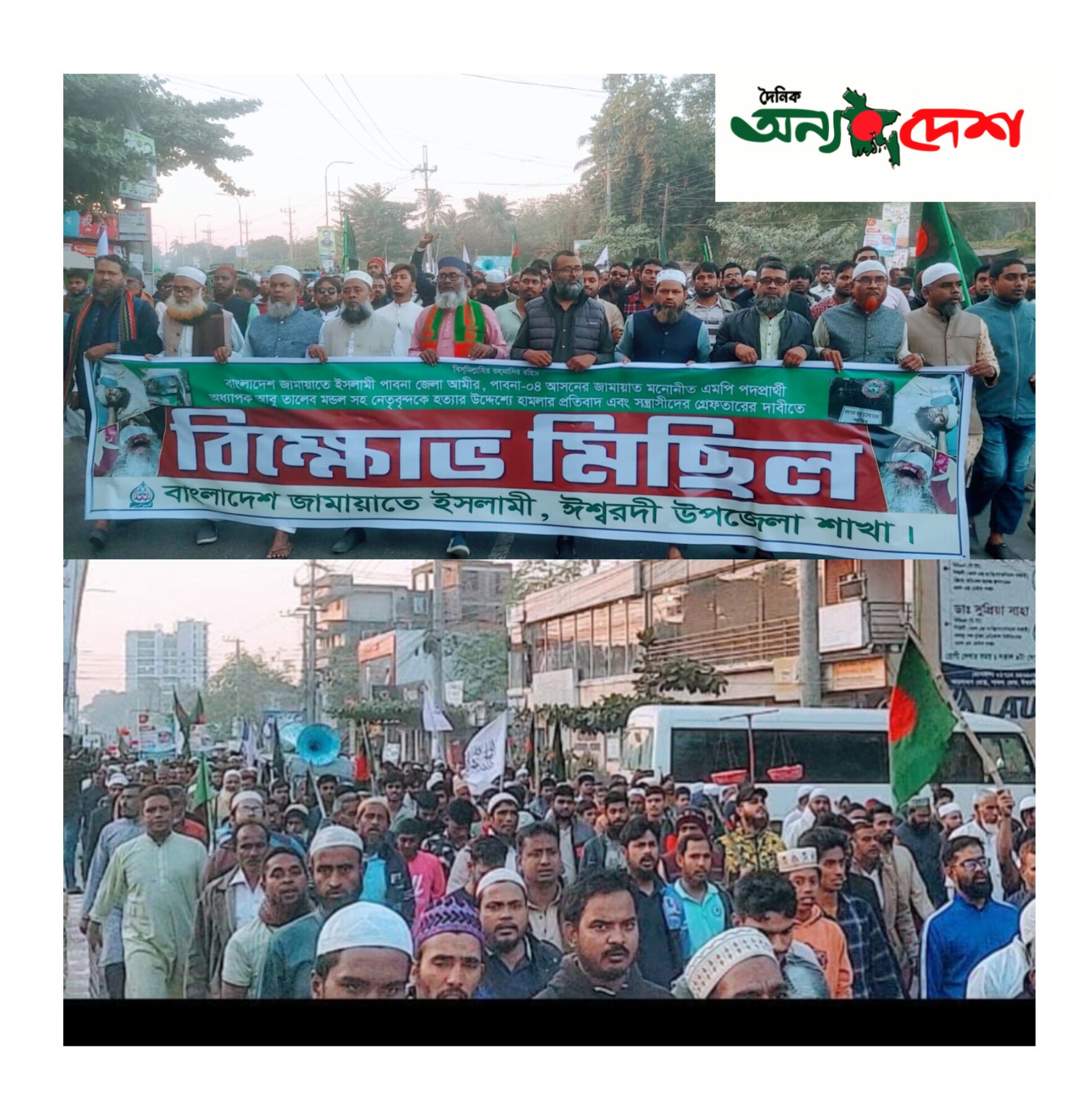 ঈশ্বরদীতে পাবনা-৪ আসনের এমপি প্রার্থী অধ্যাপক আবু তালেব মন্ডল কে হত্যার উদ্দেশ্যে হামলা, মিথ্যা মামলার প্রতিবাদ ও সন্ত্রাসীদের গ্রেফতারের দাবিতে বিএনপির বিরুদ্ধে জামায়াতের বিক্ষোভ মিছিল অনুষ্ঠিত হয়েছে।