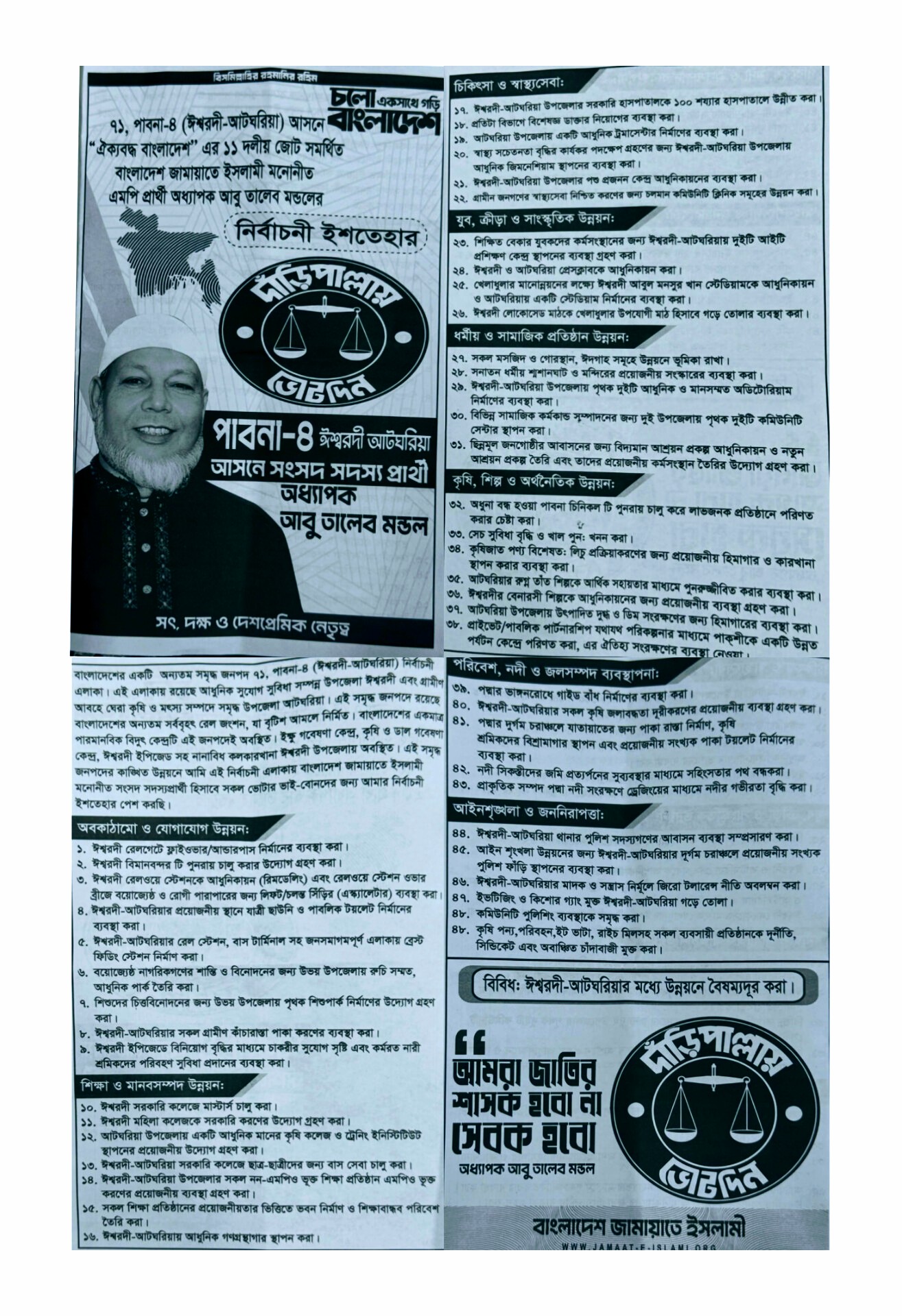 ত্রয়োদশ জাতীয় সংসদ নির্বাচনকে সামনে রেখে পাবনা-৪ (ঈশ্বরদী-আটঘরিয়া) আসনে জামায়াতে ইসলামী ও ১১ দল সমর্থিত জোটের প্রার্থী অধ্যাপক আবু তালেব মণ্ডল তার নির্বাচনী ইশতেহার ঘোষণা করেছেন। অবকাঠামো, শিক্ষা, স্বাস্থ্য, কৃষি ও আইনশৃঙ্খলা উন্নয়নকে প্রাধান্য দিয়ে ৮ টি ধাপে ৪৮ দফা উন্নয়ন পরিকল্পনা তুলে ধরেন তিনি।